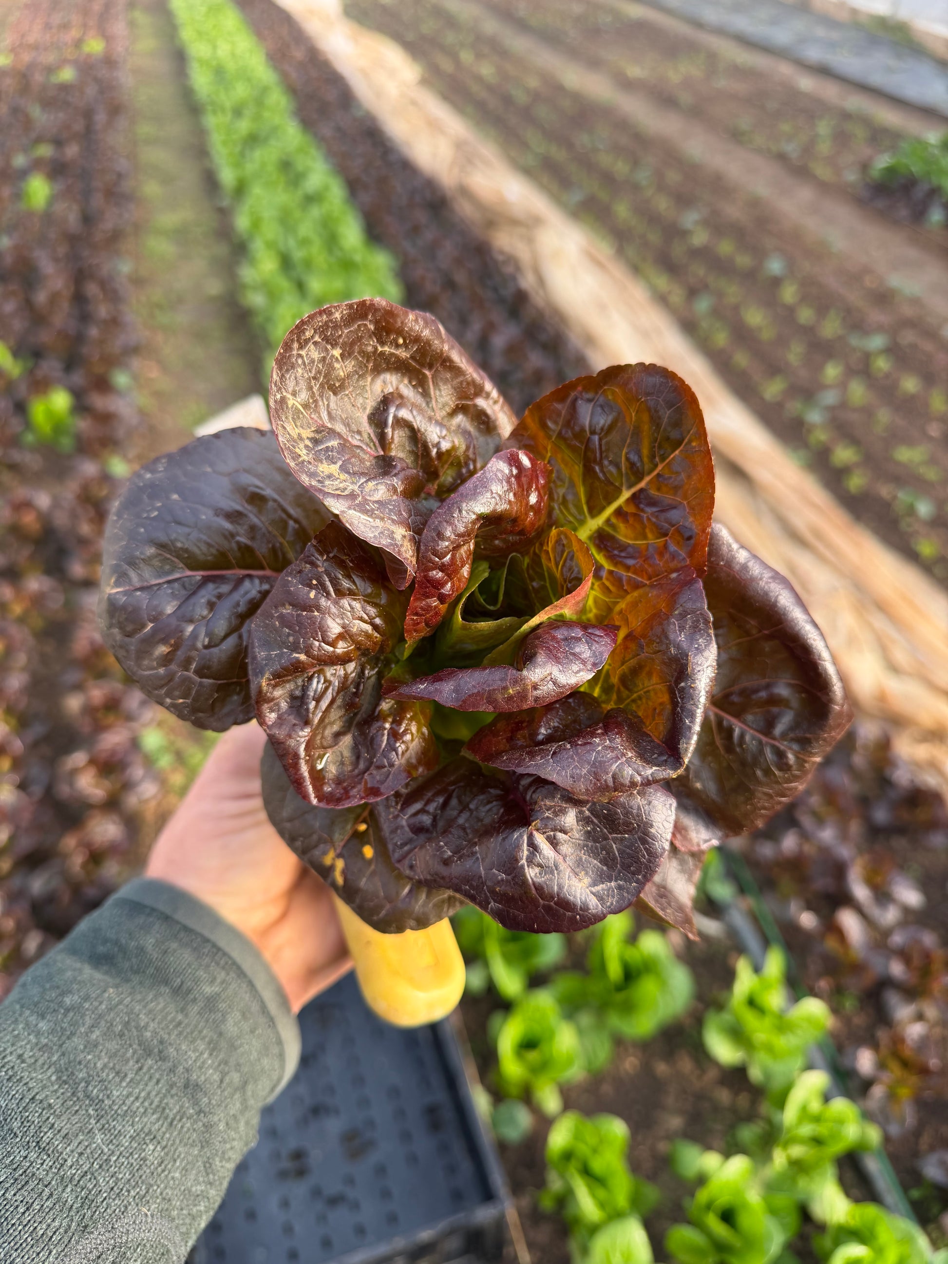 Rosaine: Dark red Little Gem mini lettuce heads. Dense heads of crisp, layered semi-savory leaves.